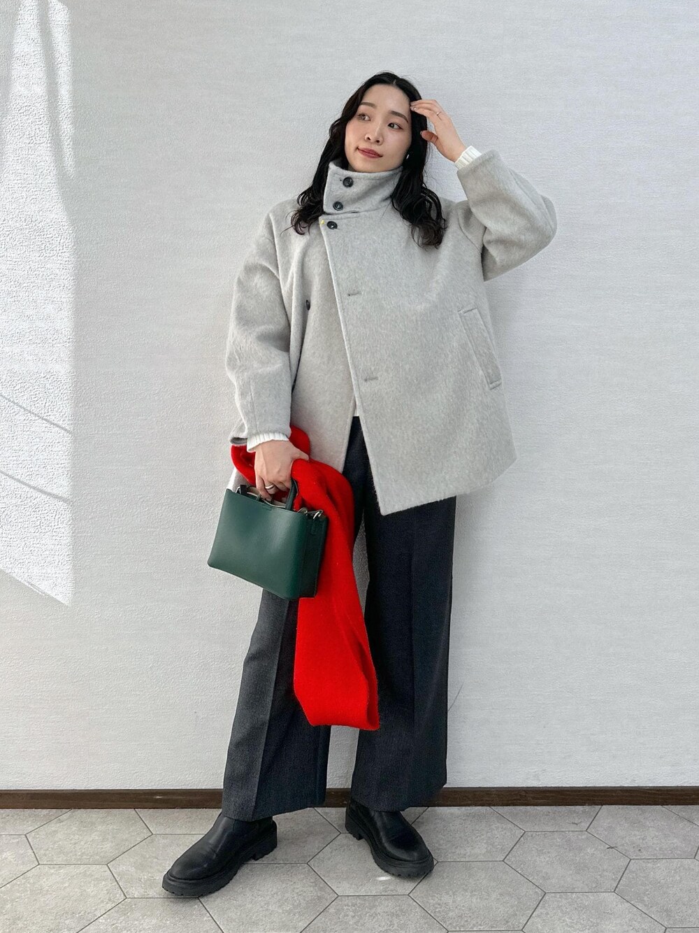 新作のシャギーコートを使ったクリスマスにオススメのコーデ。 オーバーシルエットのアウターでトレンド感があり、 軽くて暖かい♩ 小物をクリスマスカラーにしてみました。 お正月にもオススメですよ!