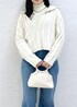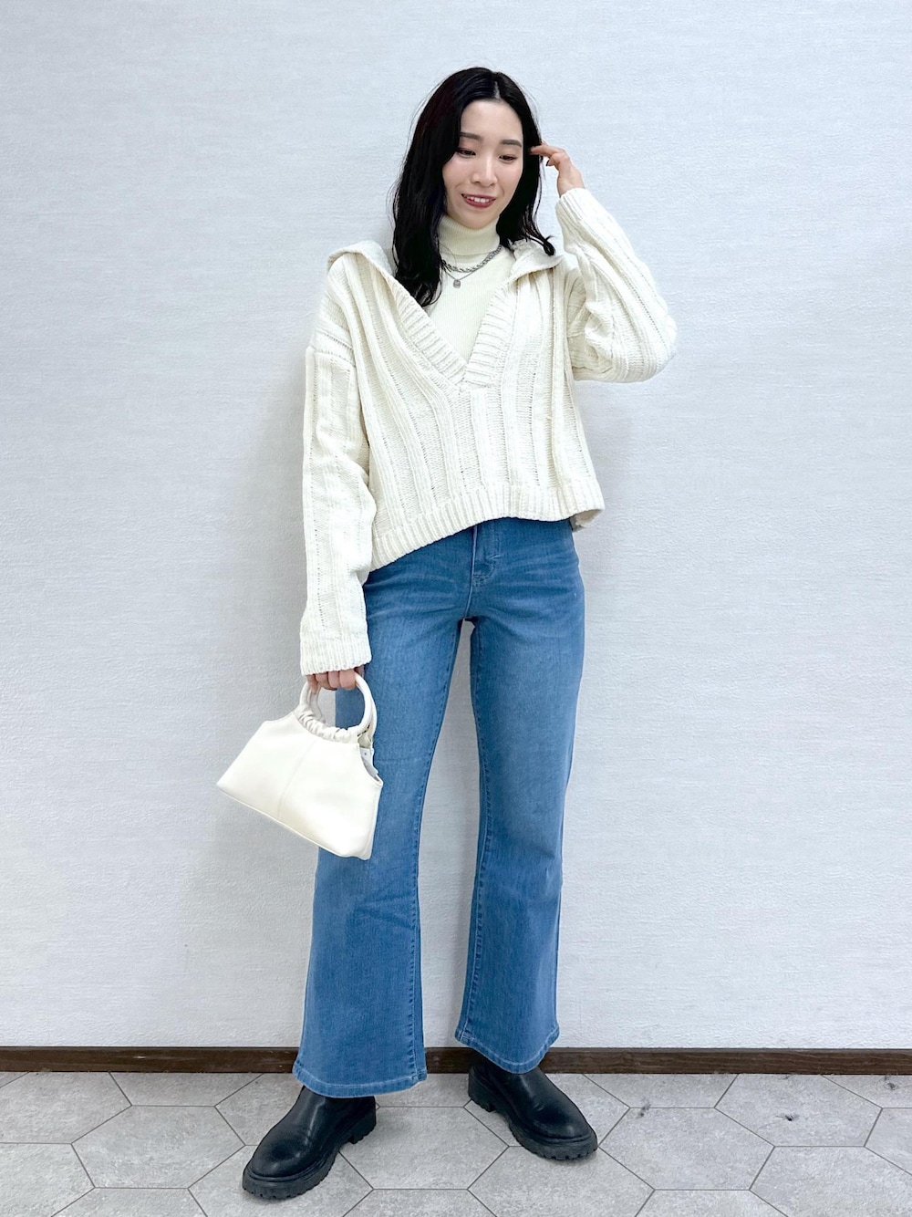 肉厚で暖かいラメニットを使ったコーデ。 ラメがほんのり入っているので女性らしくて可愛いニット。 襟元のデザインもポイントになり、レイヤードも楽しめます。 クリスマスにもオススメのコーデです♩