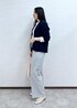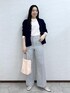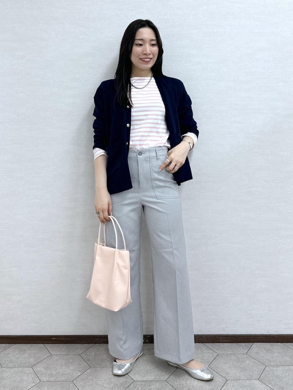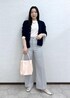 今期トレンドのピンクを差し色にインナーとバッグで 取り入れてみました。 フェミニンが苦手なのでその他は大人っぽくネイビーとグレーでまとめました。