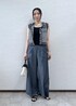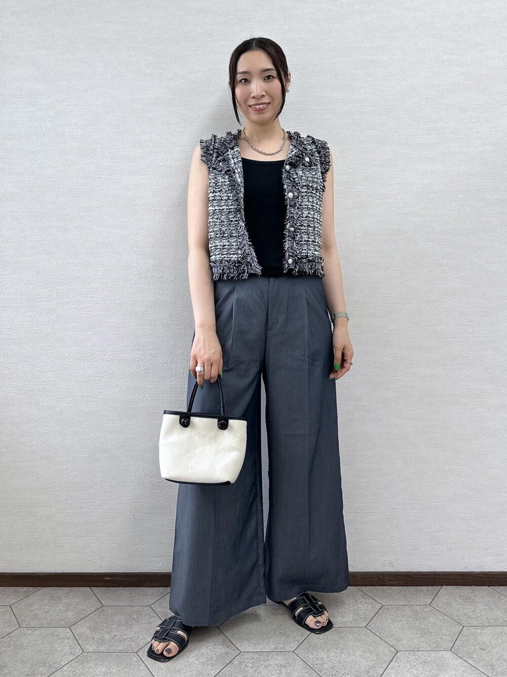 今期オススメのツイードジレを使った大人コーデ。 前は開けて少しラフな雰囲気で着用してます。 着丈は短めの38サイズを着用しているのでワイドパンツを合わせてスタイルアップするコーデにしました!
