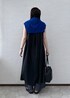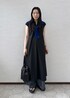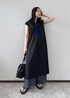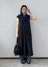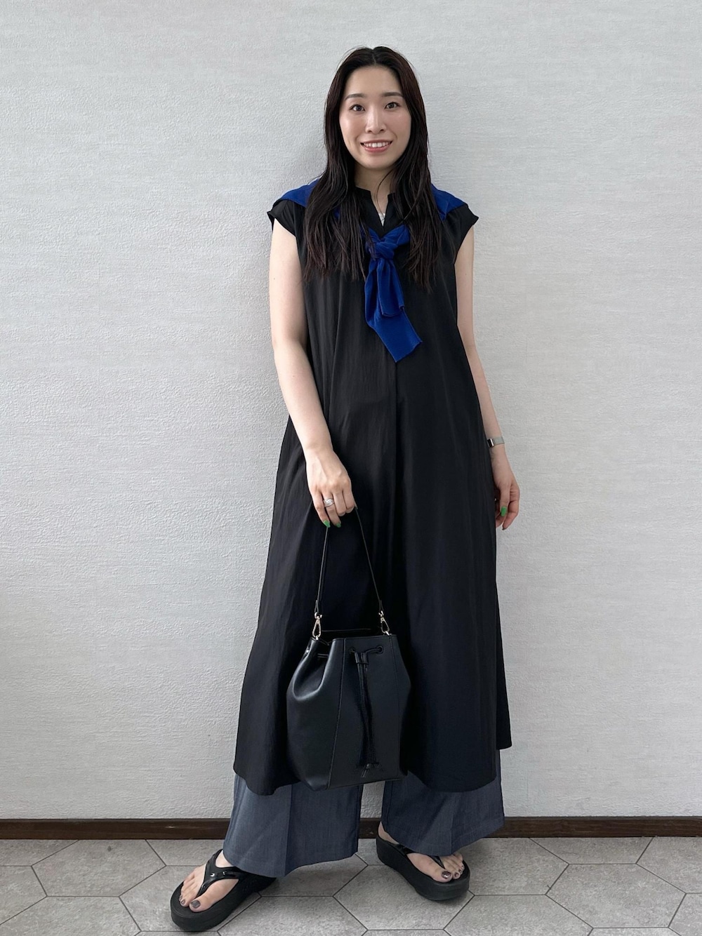 ゆったりシルエットで楽で涼しいワンピースにワイドパンツをレイヤードしました。 カラーはブラックでまとめ、ブルーのカーディガンをアクセントにしました。