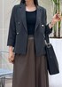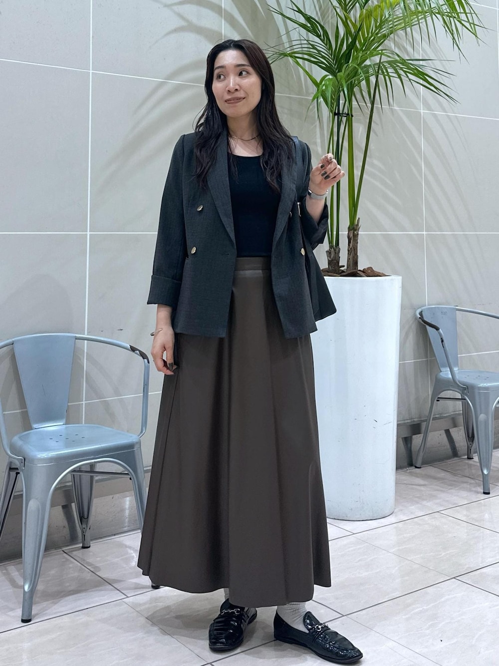 大人気の金ボタンジャケットを使って秋のオススメコーデを組みました! ジャケットは控えめなチェック柄なのでオフィスでも使いやすく万能です! スカートはレザー調で大人っぽくクールな印象になります。 ブラウンなので柔らかい雰囲気もプラスされてます♩ 小物は黒でまとめてみました!