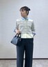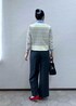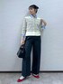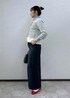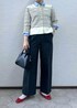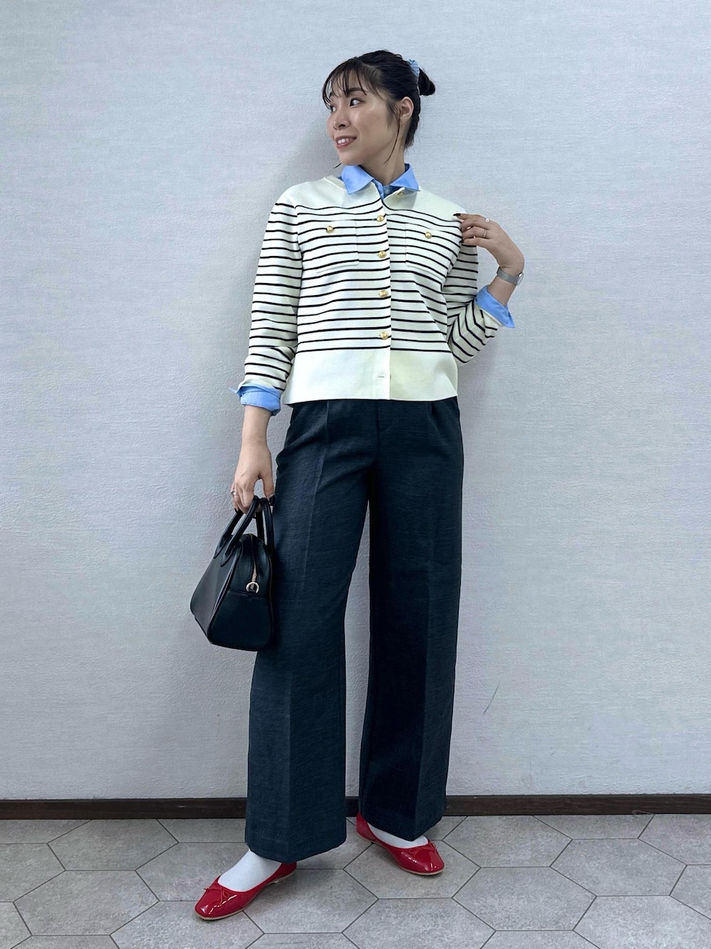 オンオフ着回しの効くミラノリブカーディガン。 カーディガンのインナーにブルーのシャツをレイヤードし、トレンド感をプラスしました。 靴にもカラーを入れてアクセントにしました。 ワイドパンツはシンプルなカラーでまとめて大人っぽい雰囲気も意識したコーデです。