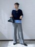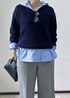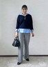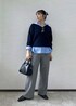ブルーのフーディーシャツをレイヤードしたトレンド感のあるコーデ。 スキッパーデザインのニットはインナーで雰囲気が変えられる優れもの! パンツや雑貨はキレイめでまとめ、トレンド感の中にも大人っぽさを意識しました♩