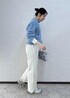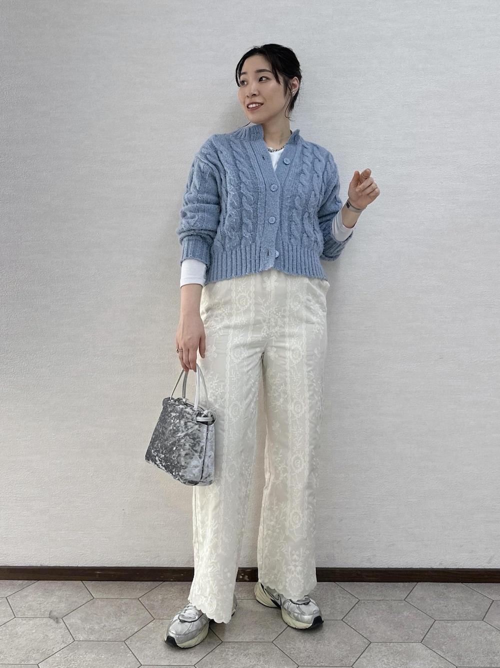 春まで使える淡いブルーのカーディガンを主役にした ワントーンコーデ。 パンツは春を意識して白を選びました! レースで甘さを出したコーデです。