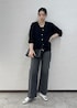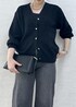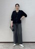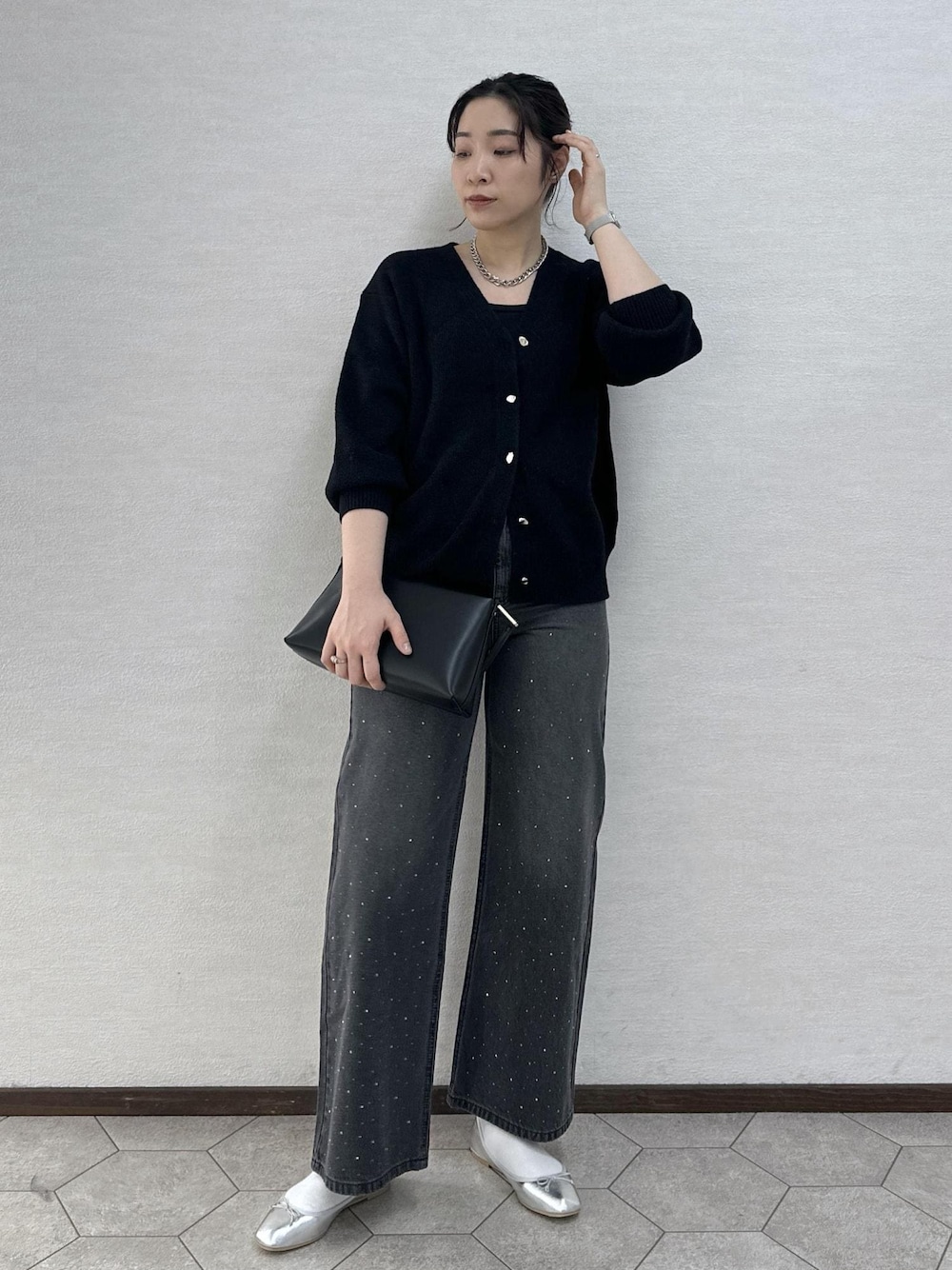 大人気のもちふわニットシリーズから新色が登場しました!! メタルボタンがポイントのミドル丈を着用しています。 大人っぽく決まるブラックにキラキラのブラックデニムを合わせて華やかさもプラスしました♩