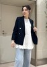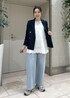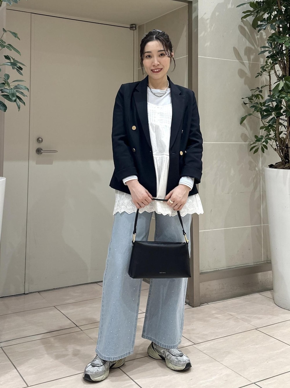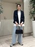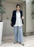 大人気の金ボタンジャケットを使った韓国っぽコーデ。 流行りのレースビスチェをレイヤードすると体型カバーも叶います♩ 全体的に淡くまとめてフェミニンな雰囲気も出しつつ、ジャケットで大人っぽくまとめました。