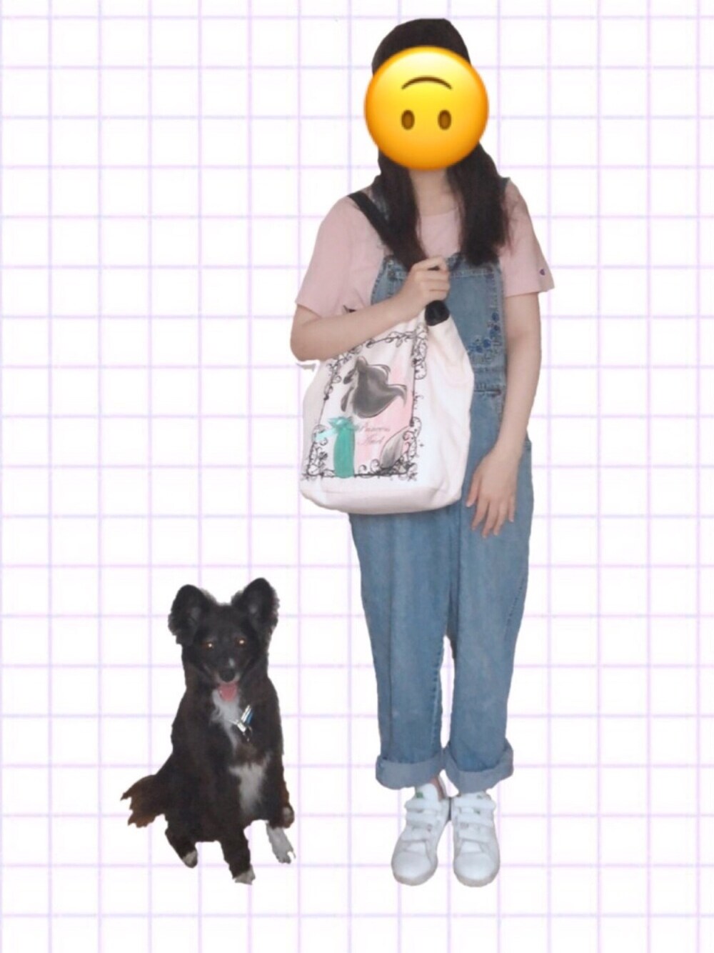 愛犬と一緒に。 オーバーオールはdejablue?ってとこの。フリマでGET。 バッグはディズニーストアで何年も前に買ったやつ。アリエル大好き。