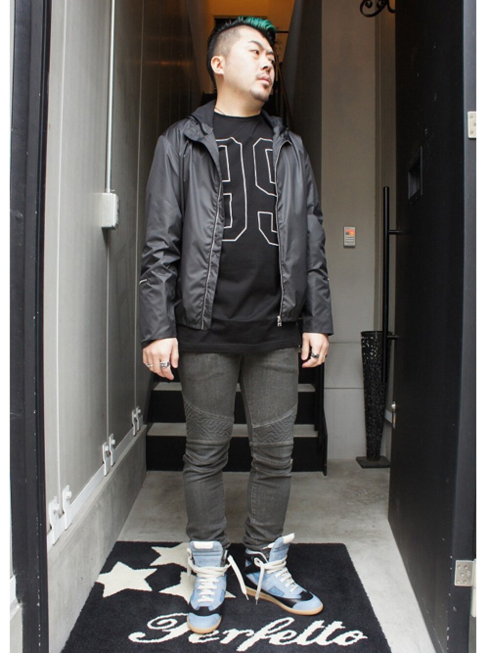 BALMAINのスキニーにハイカットスニーカーはしっくりくる。 ナイロンブルゾン:バレンシアガ インナー:doop パンツ:BALMAIN シューズ*マルタンマルジェラ