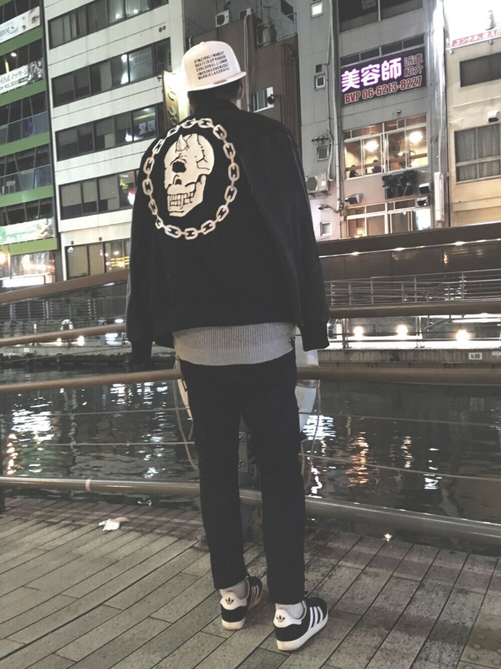 夜の心斎橋を歩く 友達に白キャップを作ってもらいました お気に入りのアウターと お気に入りのadidasスニーカーで合わせる