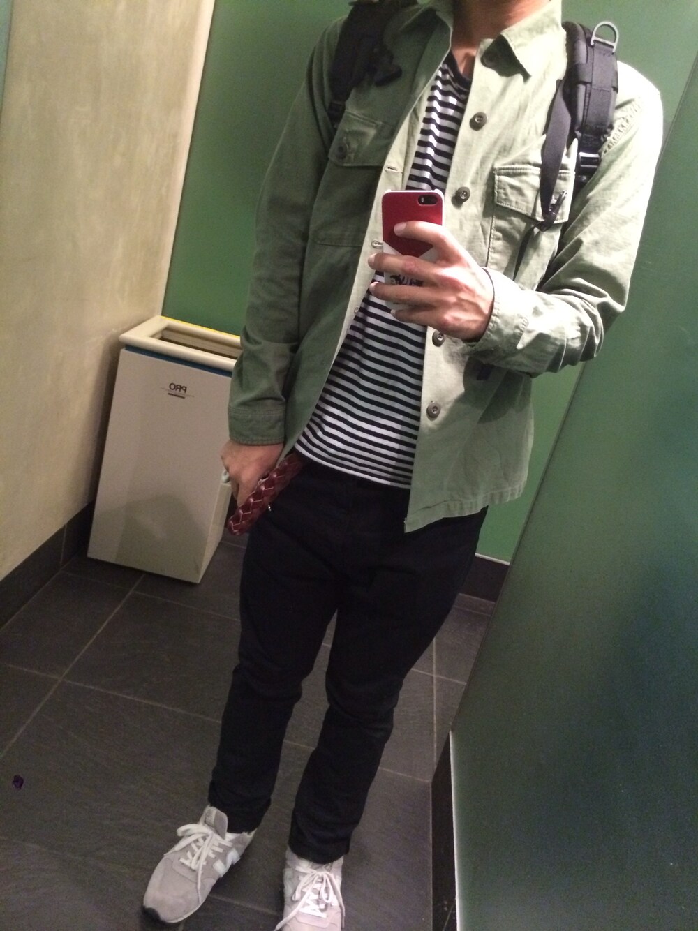 やっと着たかったカーキのジャケットシャツ着た\(^o^)/ ティーシャツ#無印 パンツ#SHIPS リュック#グレゴリー