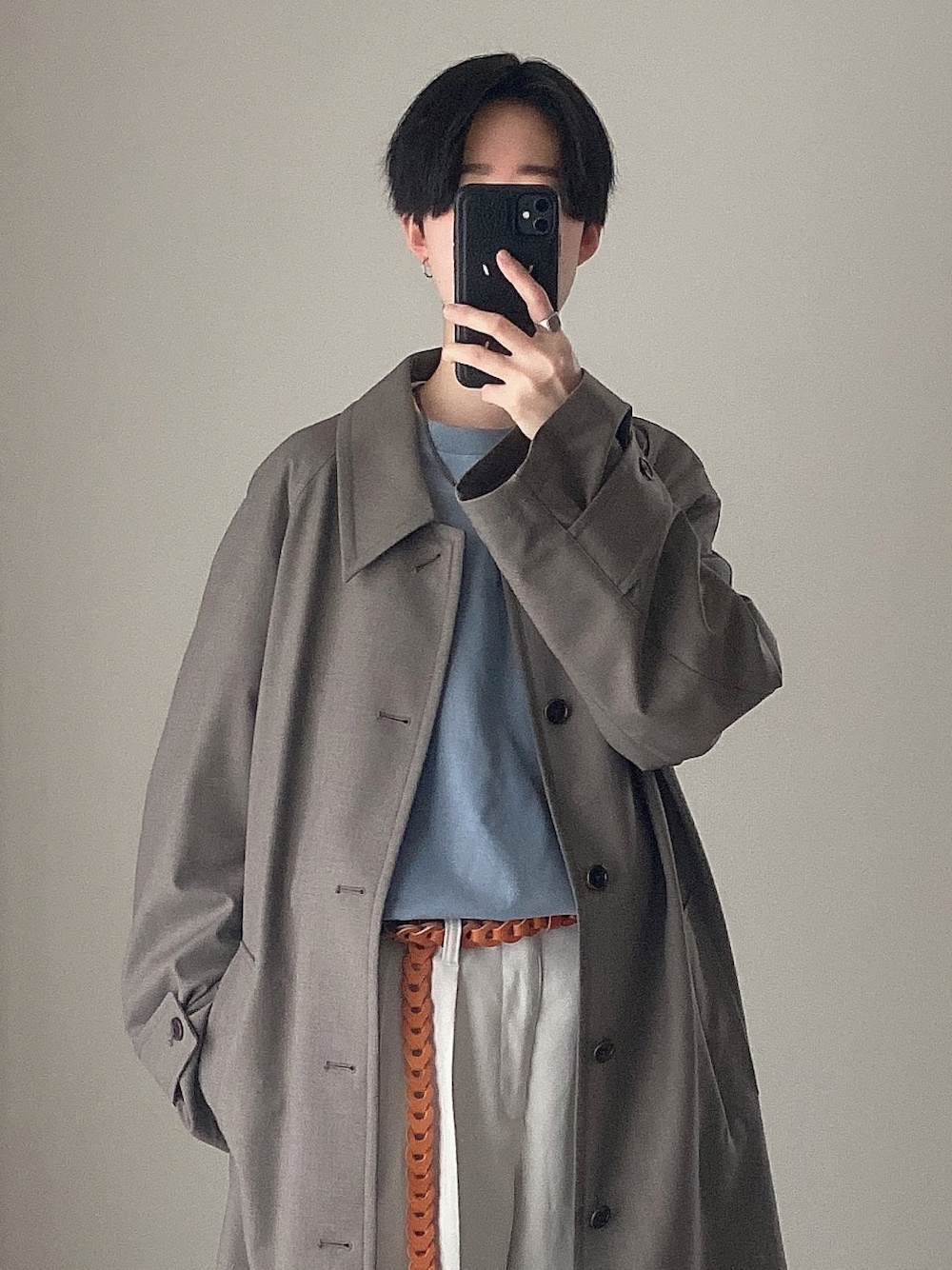 brown belt🧳 outer @lidnm_official_ BALMACAAN COCOON COAT T-shirt @wym_official_ EXTRA FINE COTTON SIDE SLIT BASIC L/S pants @lidnm_official_ BAGGY TROUSERS belt @lidnm_official_ Llife LEATHER CHAIN BELT