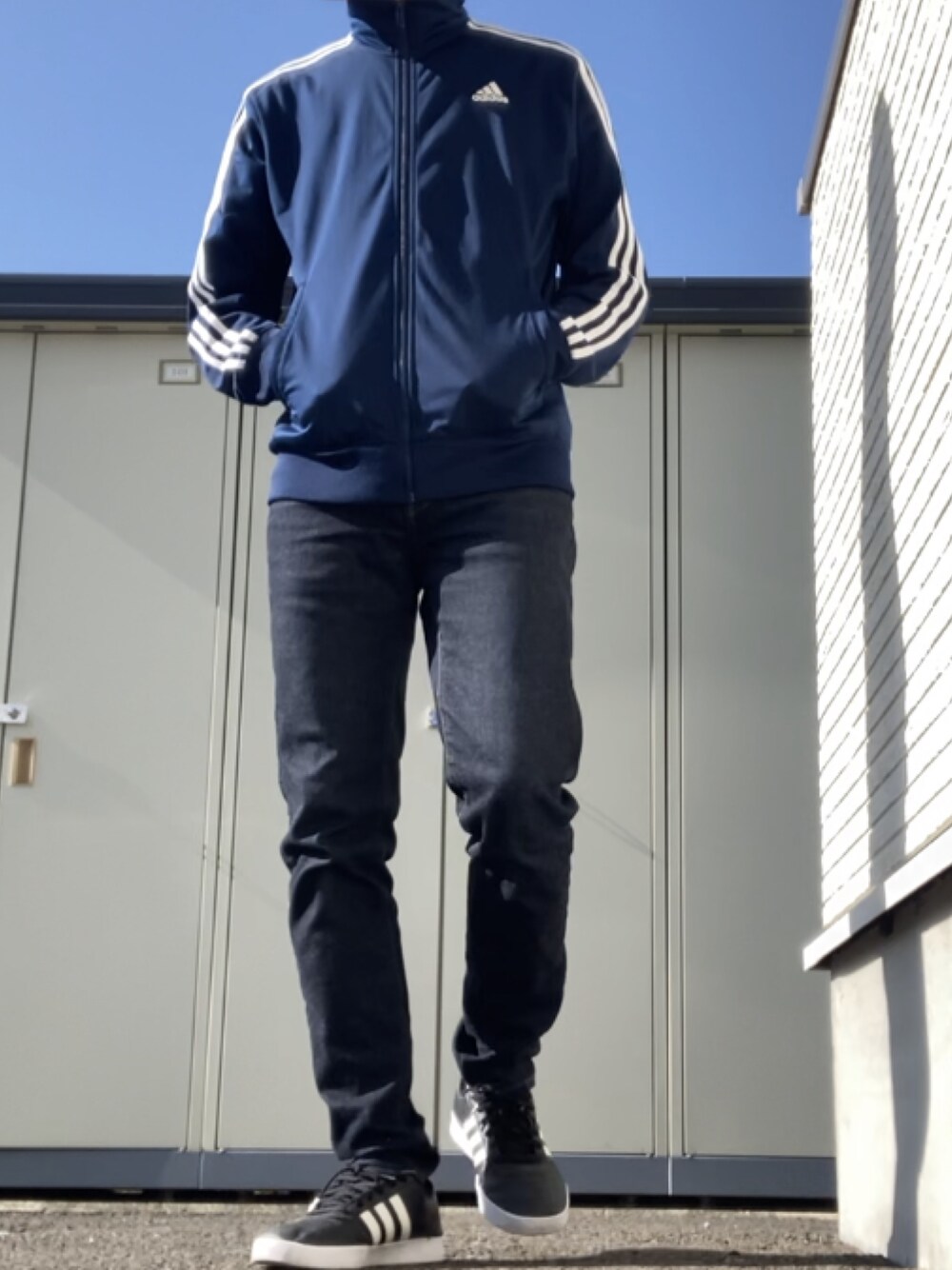 ブルー系のデニムパンツ、ブルー系のジャージを着用したメンズの春コーディネートの1枚目の写真