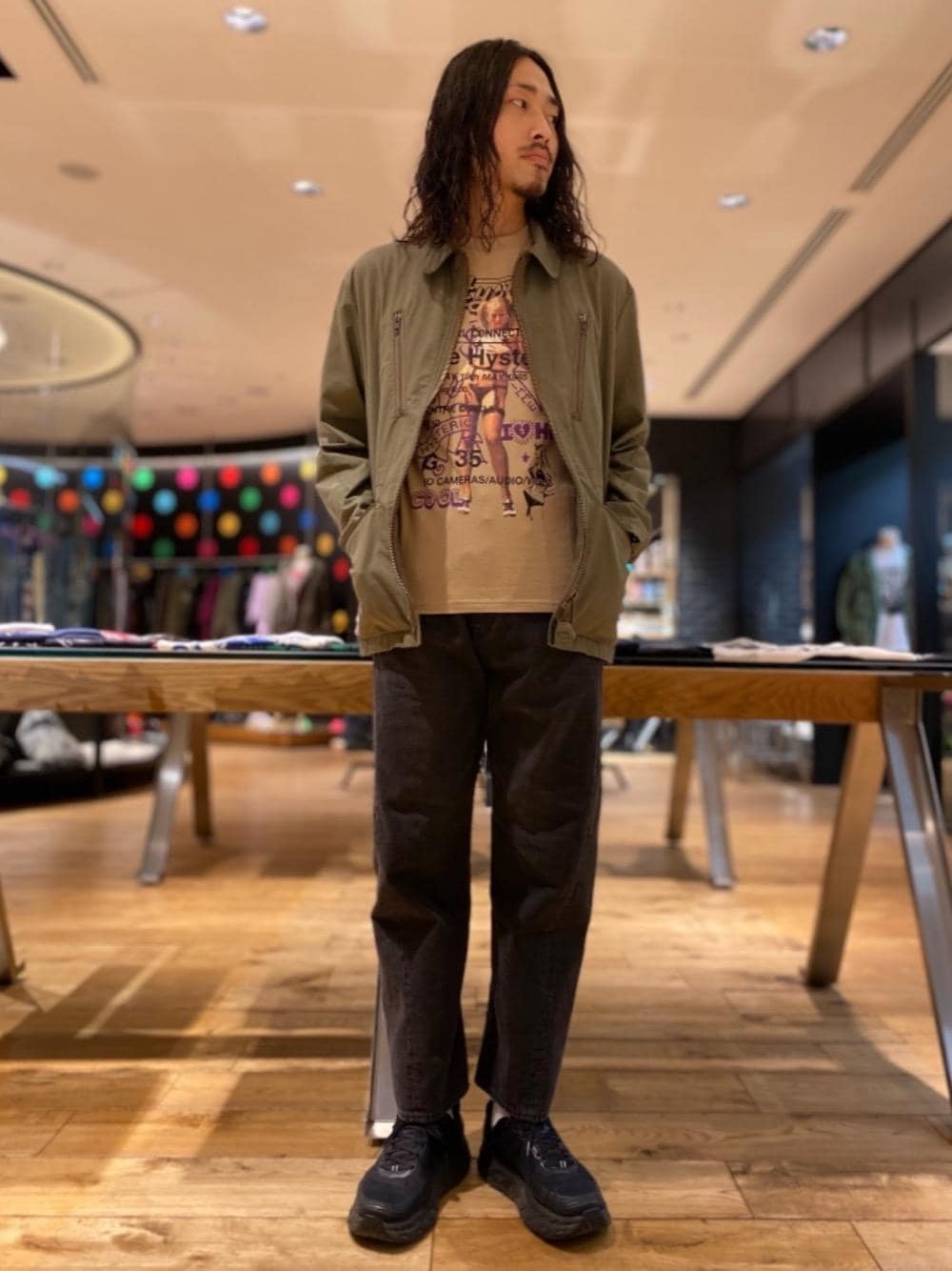 ミリタリージャケットとテーパードデニムでコーデ。さり気なくバックプリントあります!
