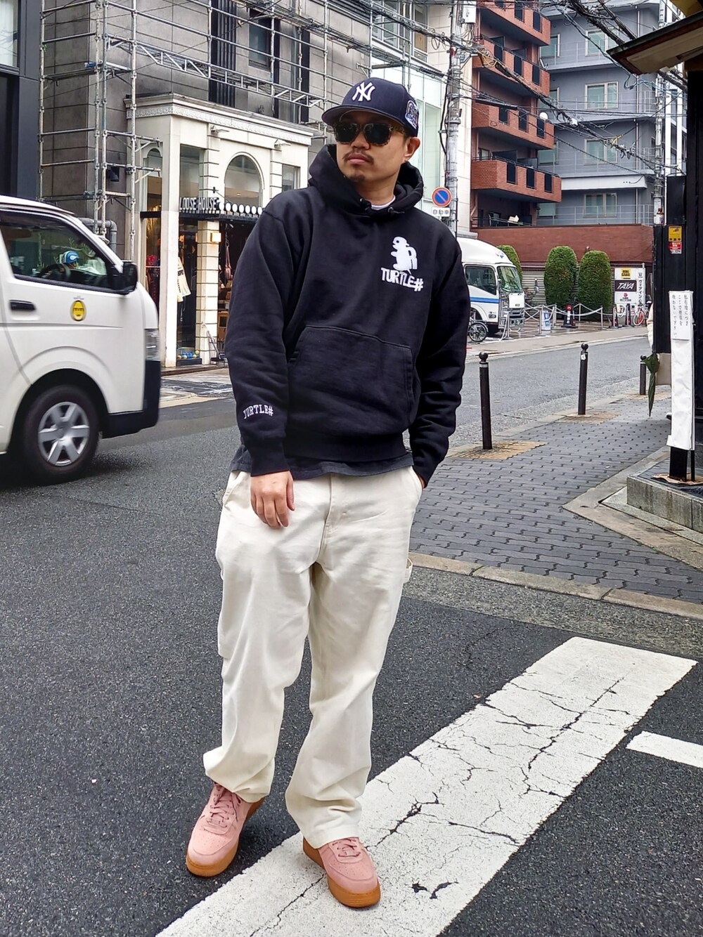 モノトーンコーデの中に春を意識したピンクを差し色で組み合わせました! まだまだ寒い日が続きますがタートルライフアパレルの極厚パーカーが最適! 胸元のデザインはマジックテープの素材で作られた一味変わったデザインです