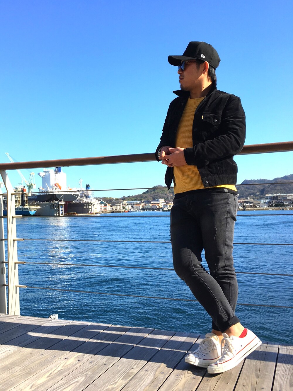 みなさんこんにちは😃😃 今日は快晴だったんで海に😁👍 背景はちょいゴチャゴチャしてますけど なかなか綺麗でした😆😆 やっぱ気分がいいですね‼️ とゆーことで今日はこんな感じで👍 トップスにマスタードからのジャケット ブラックってゆーよくある色使い😎😎笑 お気に入り😁✌️ よかったら 是非 いいね、save、フォロー等 よろしくお願いします🤡🙏🙏