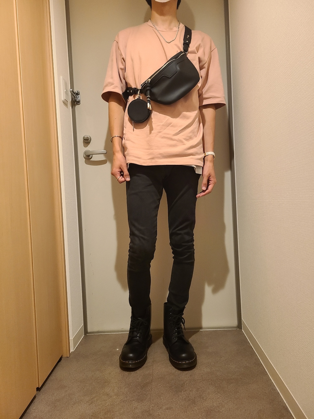 Tシャツに黒スキニーというシンプルコーデを組みました✨ ピンクのTシャツ以外ブラックのアイテムで統一しています!✨ ブーツも意外と合わせやすく、よく履いています🎵 いいねやお気に入り、フォロー頂けると嬉しいです🙇