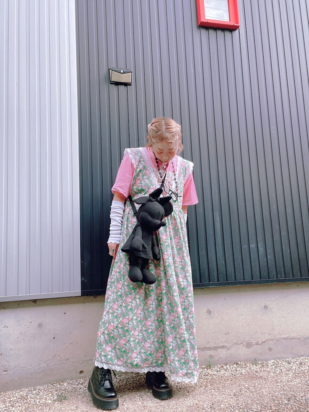 一目惚れして買ったワンピース✌️ 古着っぽくて花柄とレース色も形も大好き💚 ポイントでミニーちゃんの●🎀●バックを合わせて🖤ずっとお気に入りです😍