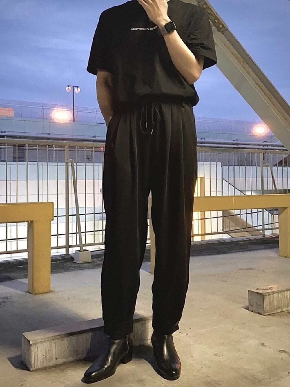 ども!りょうでございます! ベルトを取ってよりブラック味を強くしたオールブラックスタイル🌚 Tシャツの丈も短めにして足元にボリュームをもってくこのスタイルも新しくて良くないですか?😏