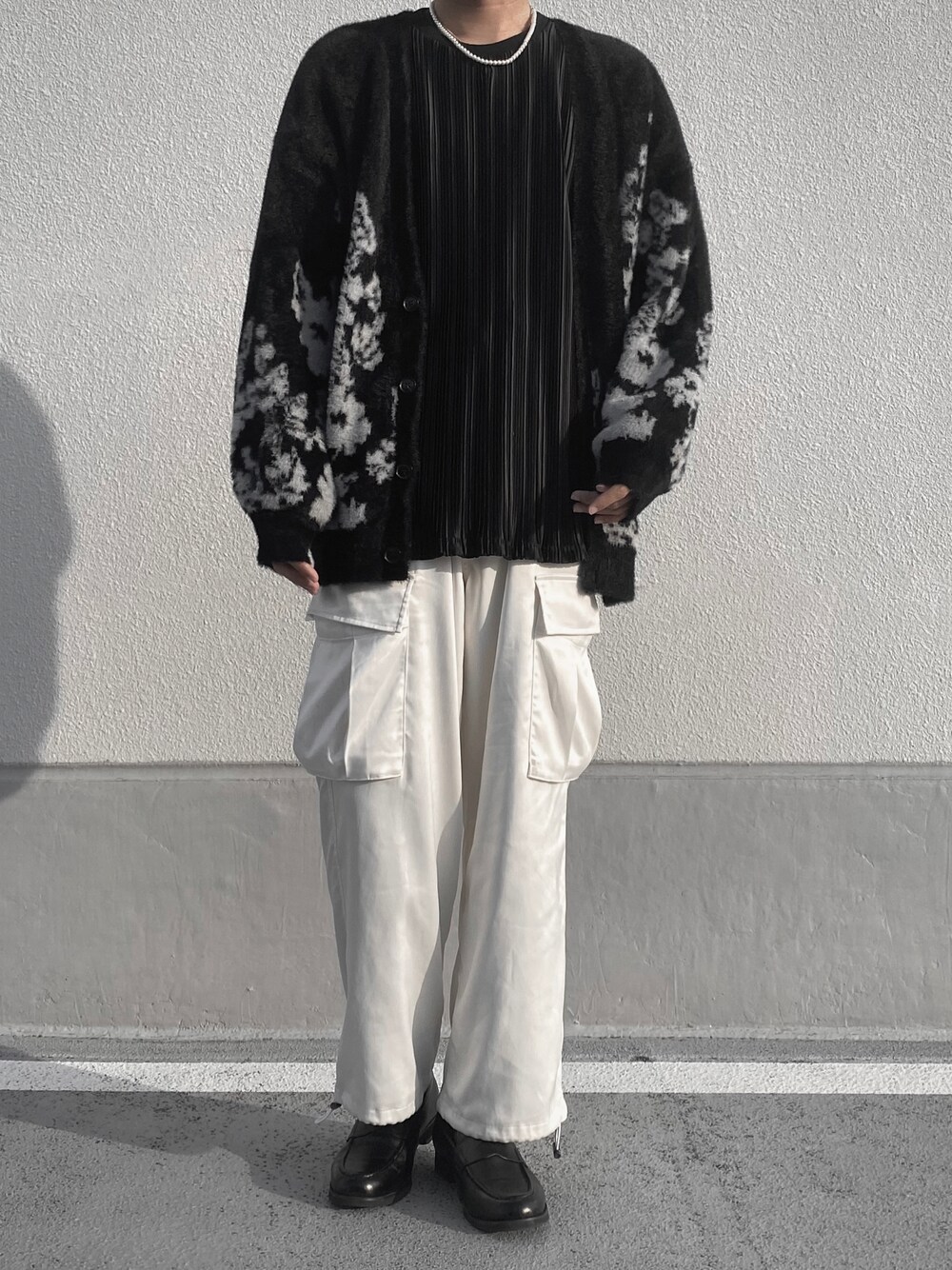 ~モードなカーディガンコーデ~ カーディガンを前開きで着ると胸元が寂しくなりがち、、 そんな時は色物ネックレスを付けてみたり、少し変わったディテールのインナーを合わせるとこなれ感出てgoodです👍 HAREの花柄カーディガンはモノトーンながらも、特徴的な花柄が付いてる事でコーデ全体を暗めに組んでも重い印象にならないから優秀👏👏