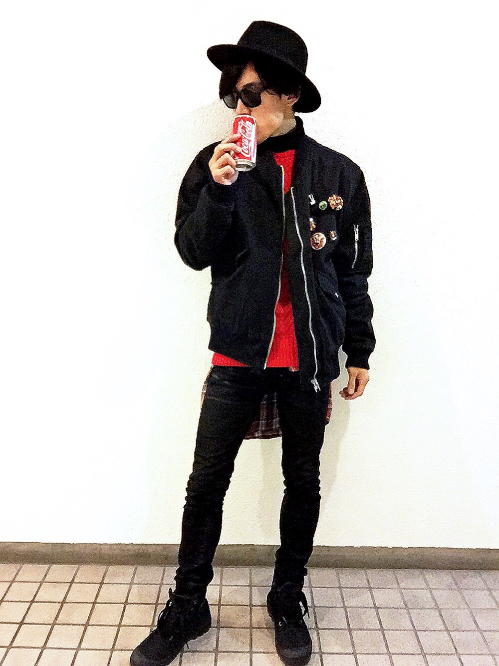 赤×黒で最も有名であろう、某コカ・コーラさんとの共演!! コカ・コーラ先輩出演ありがとうございます!(●´ϖ`●) MA1をROCKテイストに着てみた。 アダムのニット発色良くてお気に入り!! MA1の左胸に大好きなVAMPSの缶バッジを付けて1人で喜んでます。笑