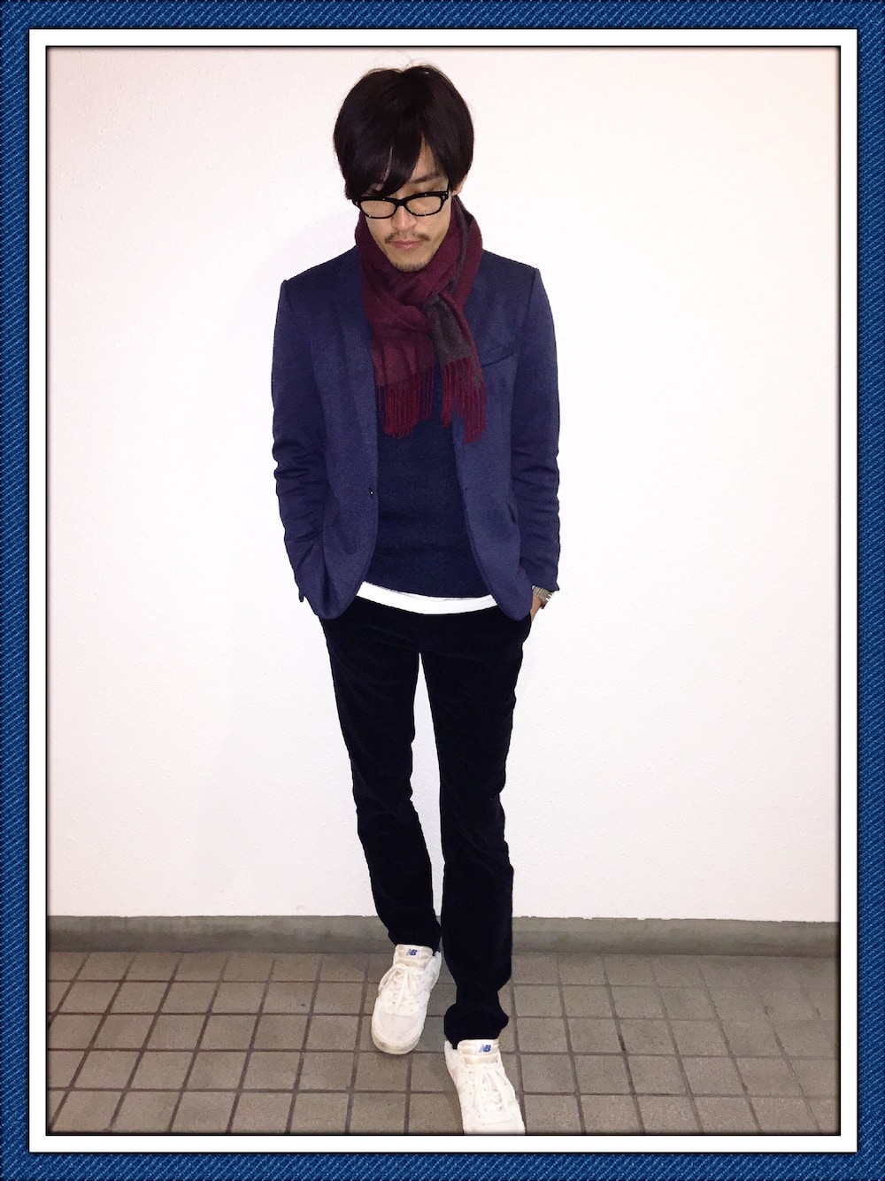 ネイビーワントーーン(●´ϖ`●)b どう頑張ってもコーデュロイの質感のせいか パンツが黒にしか見えない! 実物はネイビーなんです!! ネイビー、、、なんですよネイ(ry 自分の中ではだいぶフレンチカジュアル感出した方やと思う。 アクセントにボルドーのマフラー! 白Tと白スニーカーで爽やかな印象を!