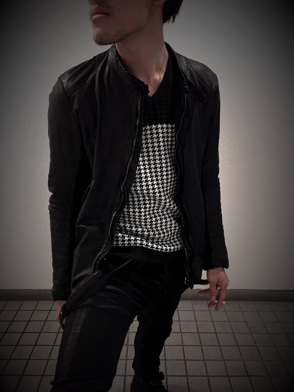 AMeLIEの千鳥柄のバイカラーニット チェスト部分の黒の所もダークトーンの千鳥柄になっててかっこいいです。 モノトーンコーデに大活躍間違いなし。