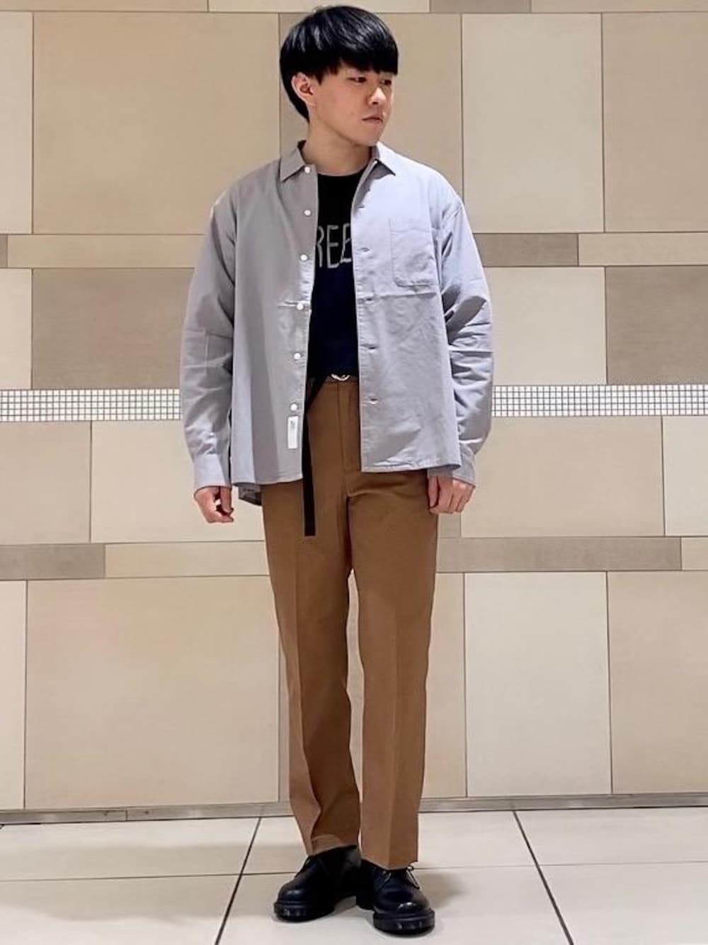 【身長168cm 着用サイズ:Tシャツ L それ以外M シューズ7】 春らしいライトグレーの開襟シャツをモカのパンツに合わせました。Tシャツとシューズをブラックにすることで色味にメリハリをつけています。腰から下げているブラウンのベルトもポイント。