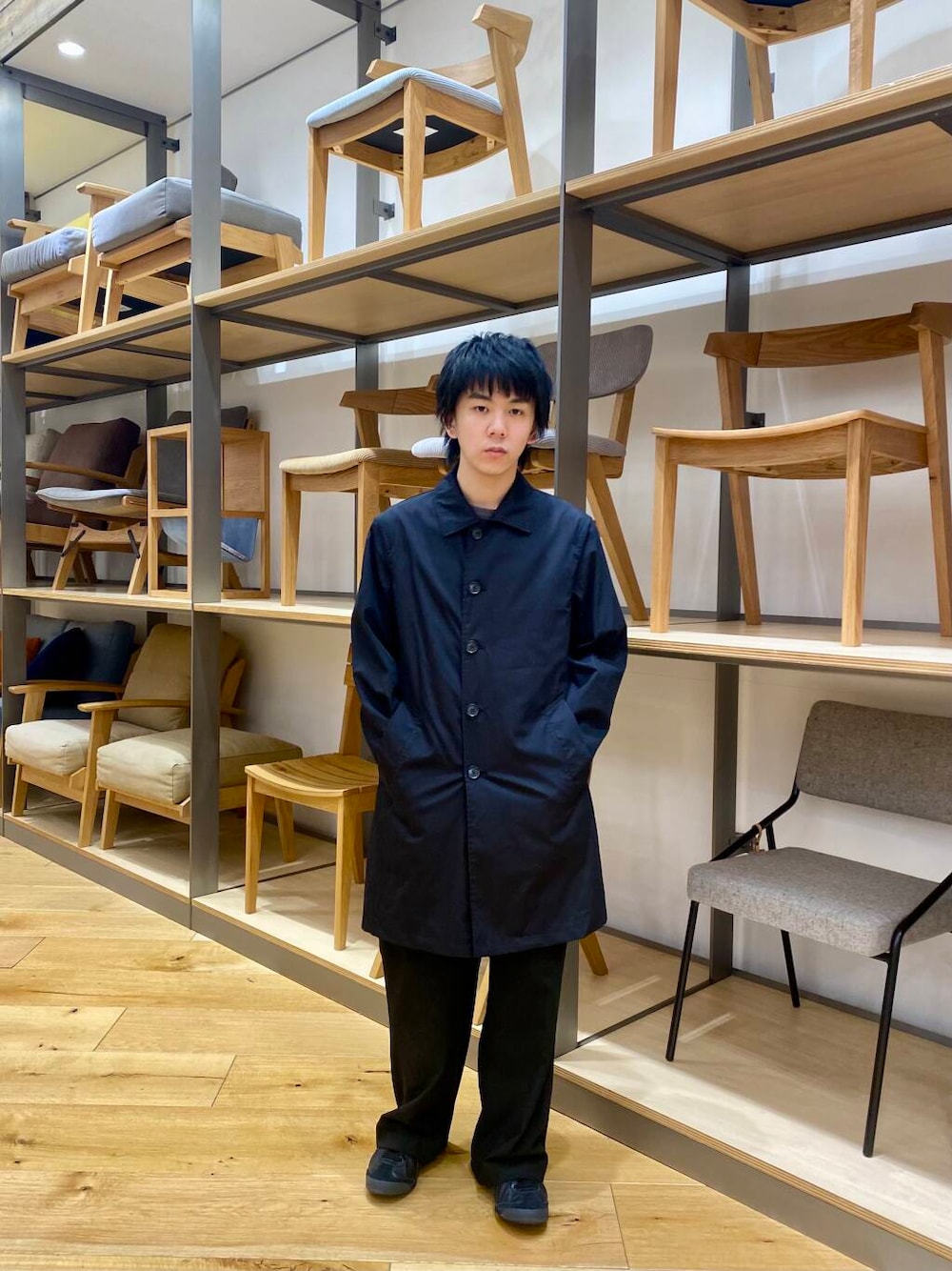 サラッとした生地感のスプリングコートでシルエットは細めです。どんなシーンでも使える雰囲気です。ブラックおすすめです。