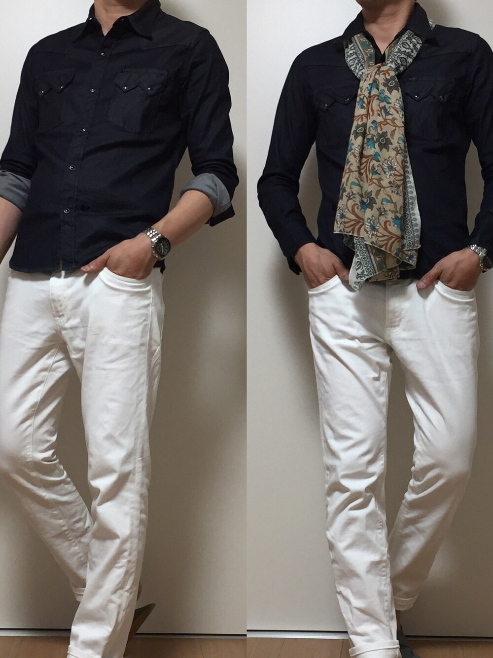 今日のコーデは、春秋の鉄板コーデ😊 、 、 ブラックのウエスタンシャツに、 UNIQLOのアンクルパンツを合わせたシンプルコーデ😆✨ 、 ブラックシャツにホワイトパンツは、 春秋の鉄板ですよね🤓 、 シンプルコーデを毎年楽しむなら、 ストレート幅以内にしておけば間違いないですよ😉💙👏