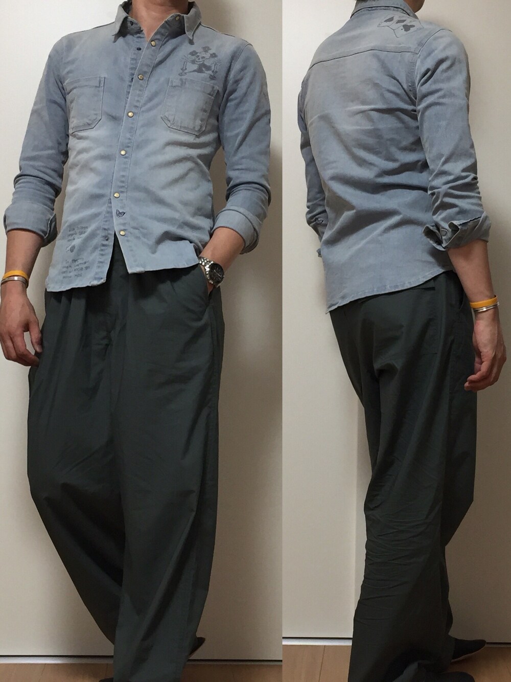 今日のコーデは、休日コーデ😊 、 、 UNIQLO Uのワイドパンツに、 簡単にデニムシャツを羽織りました😆✨ 、 ジャージ素材とまた違うサラサラ感が、 イージーパンツにはあっていいですよね☺️ 、 デニムシャツもスカルやトランプのプリントがしてあり、 ちょっと遊びがある所もお気に入りです👍