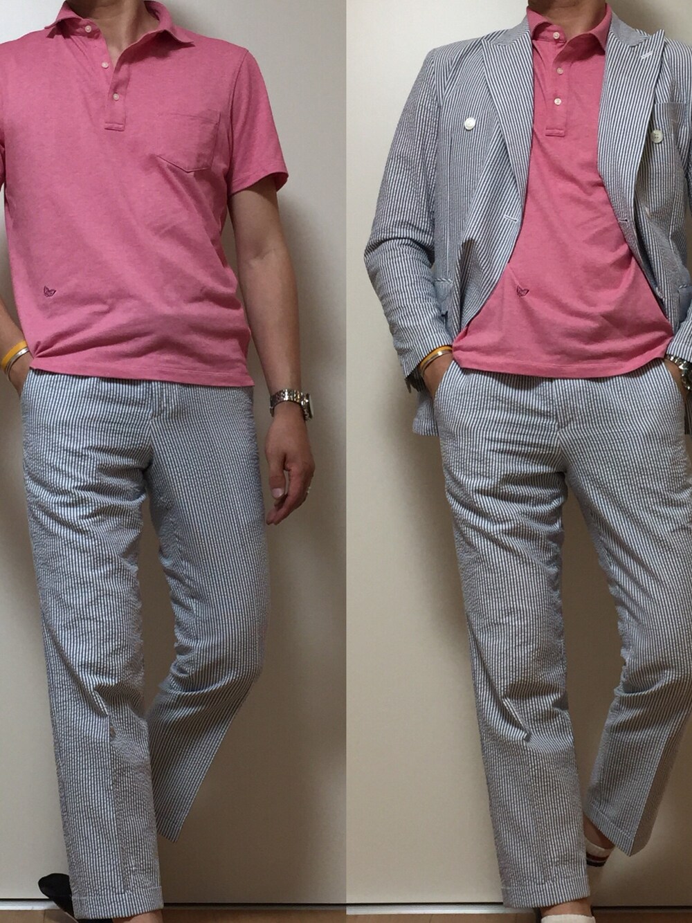 今日のコーデは、ピンクポロコーデ😊 、 、 シアサッカーのセットアップと合わせてみました😉💙 、 昼は暑いくらいなので、 ジャケットは朝だけですね😂
