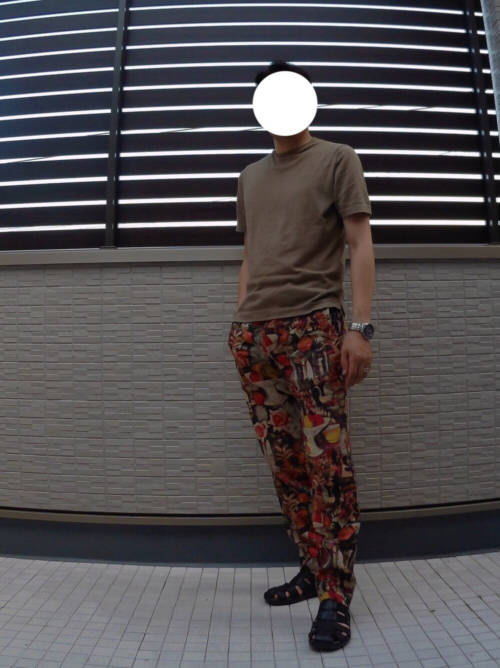 今日のコーデ😊 、 、 柄のハデハデなボトムスには、 ギマコットンの柔らかニットTを合わせて、 落ち着いた雰囲気に😆✨ 、 レザーサンダルで夏っぽさを上乗せしました🤣