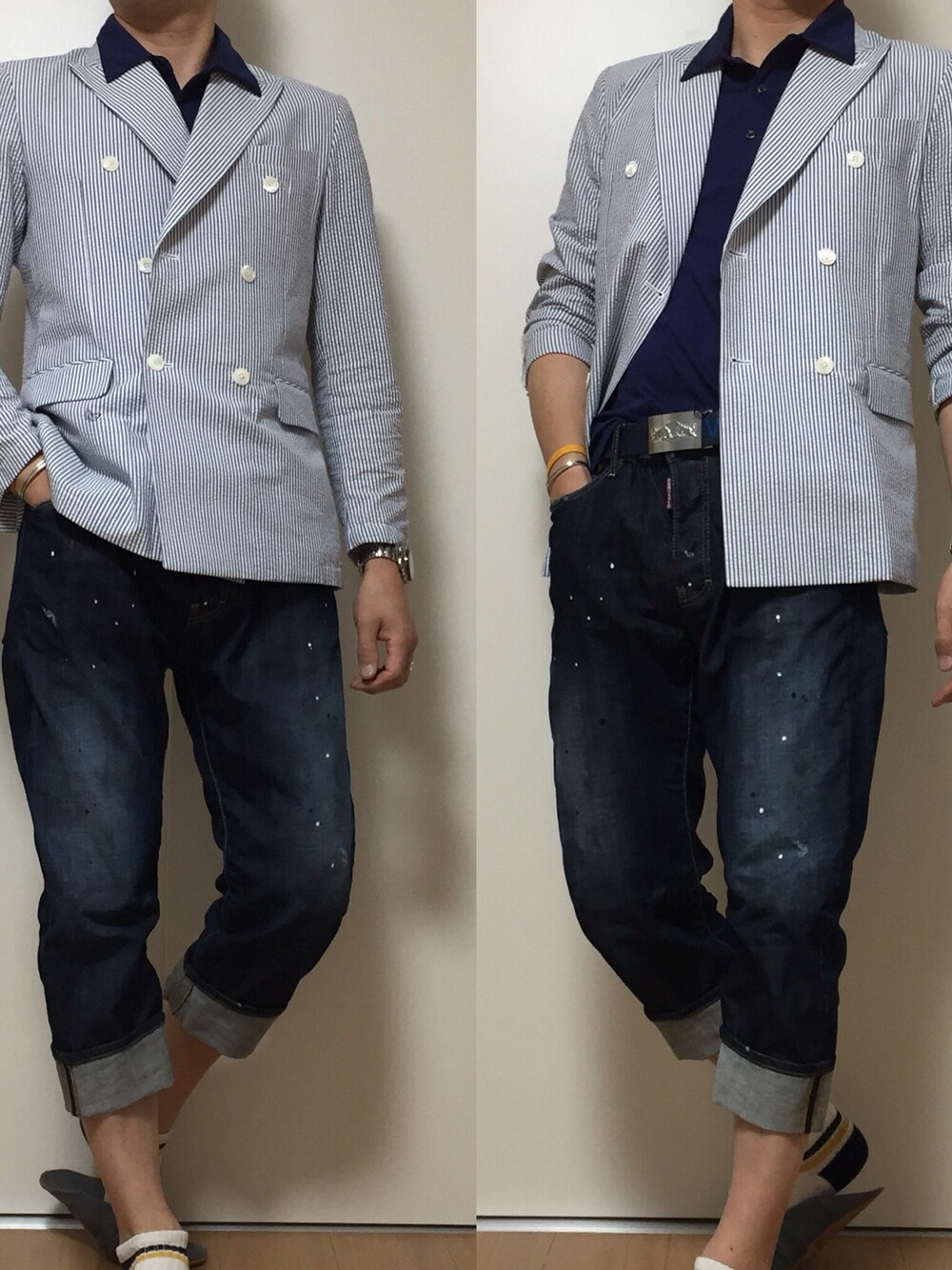 今日のコーデは、春向きジャケパンコーデ😊 、 、 クロップトデニムにシアサッカーのダブルジャケットを合わせた、 春向きのジャケパンコーデ😁 、 インナーも微光沢のあるコンフォートポロを使い、 少し大人っぽく😉💙👏 、 大人っぽくついでに襟出しも🤣