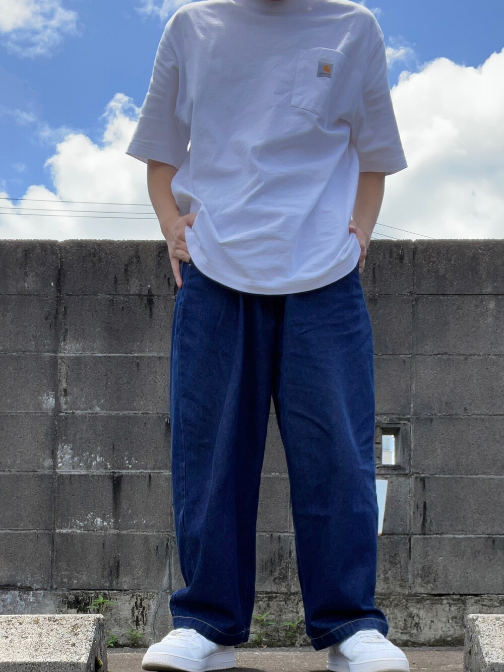 カーハートの白Tシャツとワイドデニムパンツコーデ!シンプルで良い! @street.rinrinインスタもよろしく〜!フォロー返します!