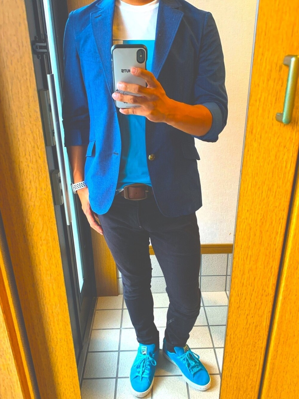 いつもご覧頂きありがとうございます😊 今日はブルー系でまとめて見ました! 涼しい生地感のジャケットと鮮やかなブルーのプーマスエードがお気に入りです!