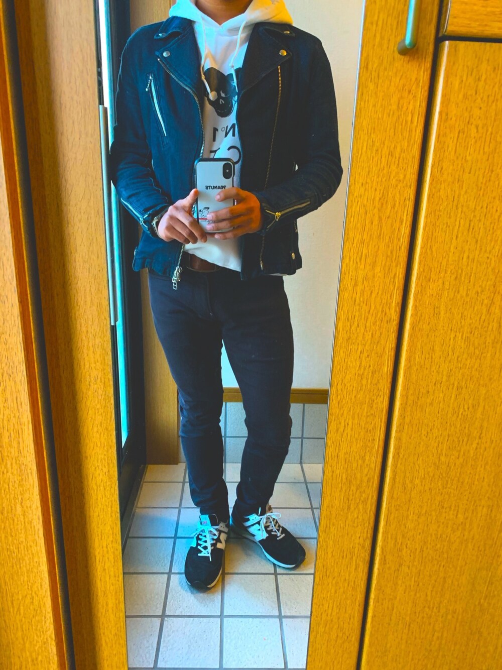 いつもご覧頂きありがとうございます😊 白のプルオーバーのパーカーにストレッチ生地のネイビーのライダースを合わせました! 秋冬はいろんなアフターを着れるから楽しみです!!