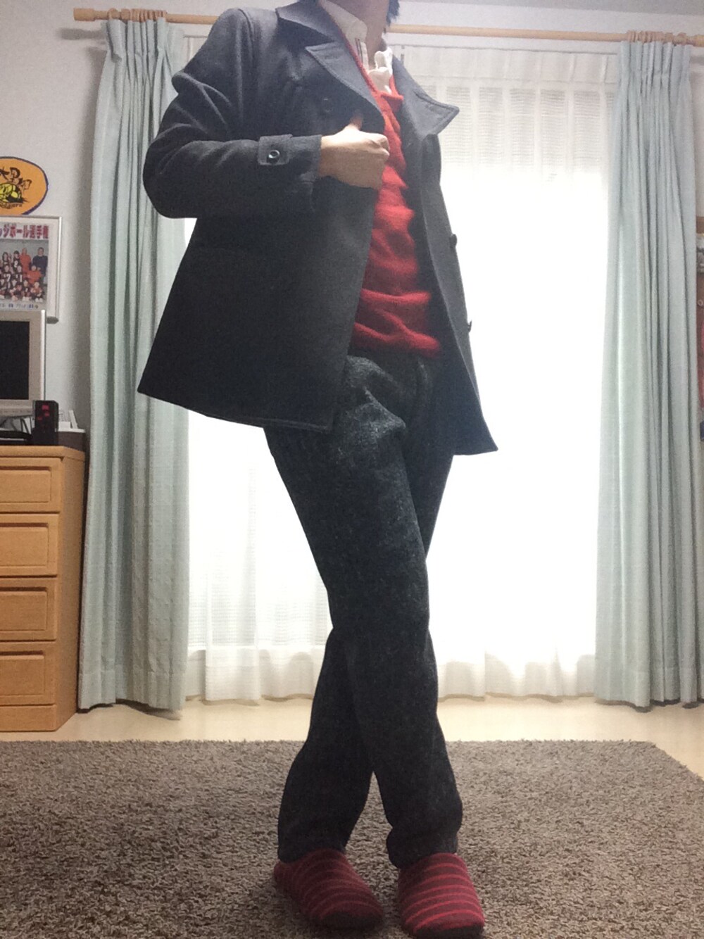 同系色のPコートとスウェットパンツで セットアップ風に。
