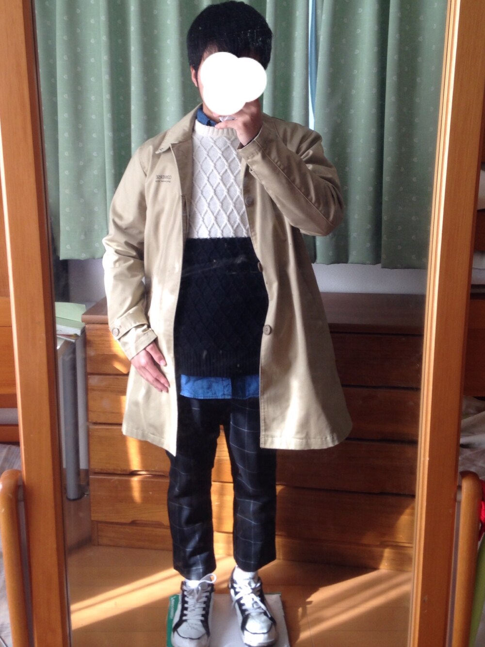 昨日のコーデです。 黒系チェックのスラックスと淡色のロングデニムシャツに白黒の切り替えデザインのケーブルセーターとベージュのステンカラーコートを合わせました‼︎ モノトーン+ネイビー+ベージュのコーデです‼︎ 上手くキレイめコーデに出来たと思います‼︎ これからは撮り溜めでの不定期投稿が増えます。