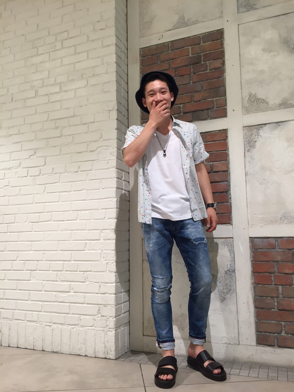 夏らしく淡い色のコーディネートです。 普通のシンプルコーディネートとは違って柄やダメージがあるところもポイントです。 やっぱり夏はサンダルですよね👡