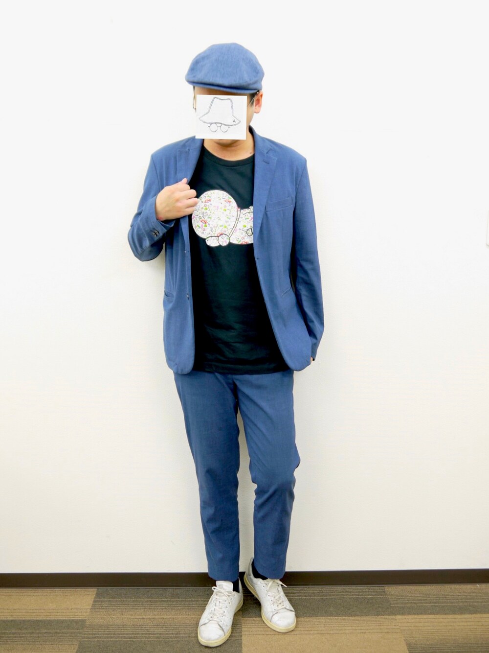 同色合わせのセットアップ+ハンチングでクラシカルながら、UTのドラえもんで遊び心を。 プリントのカラーに合わせたスニーカーで、子供っぽくならない様にまとめる。