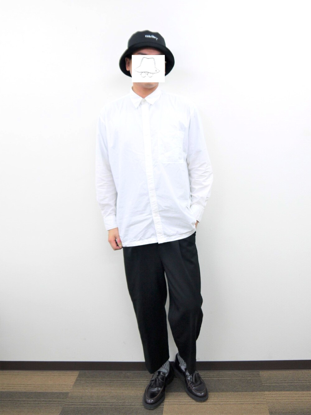 キレイ目なスタイルを、少しルーズなシルエットとバケットハットで着崩してます。