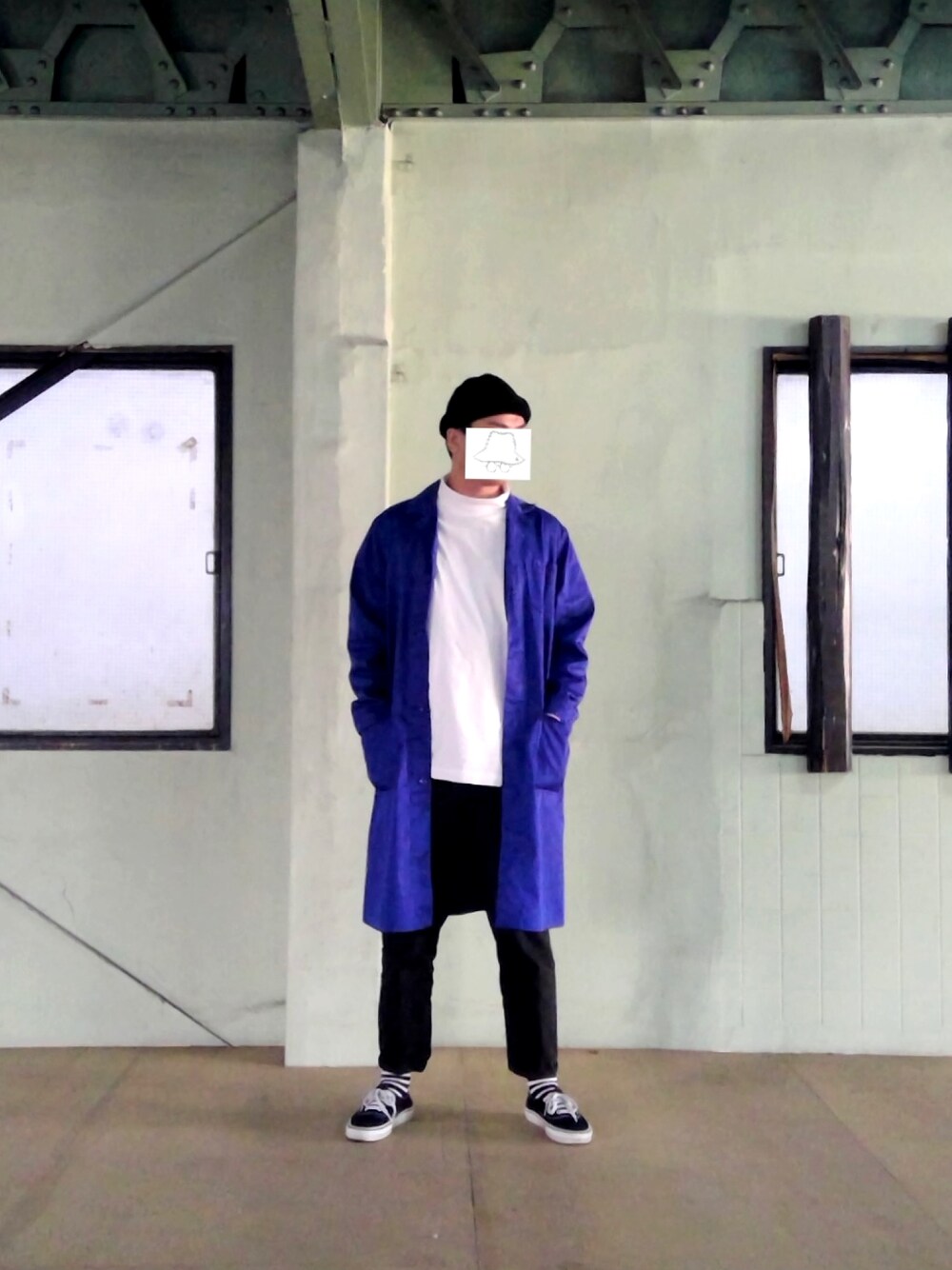 ロイヤルブルーのカバーオールで、キレイ目なワークスタイル。