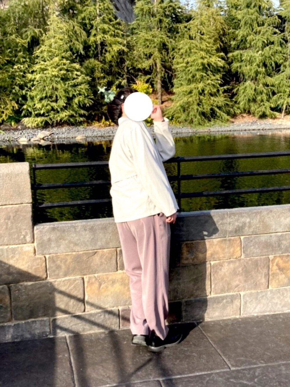 いつもご覧いただきありがとうございます! 正面の写真じゃないですが、この日のコーデめちゃくちゃ気に入ったので載せてみます。 またパンツの色味が光の加減でピンクっぽくなってます。
