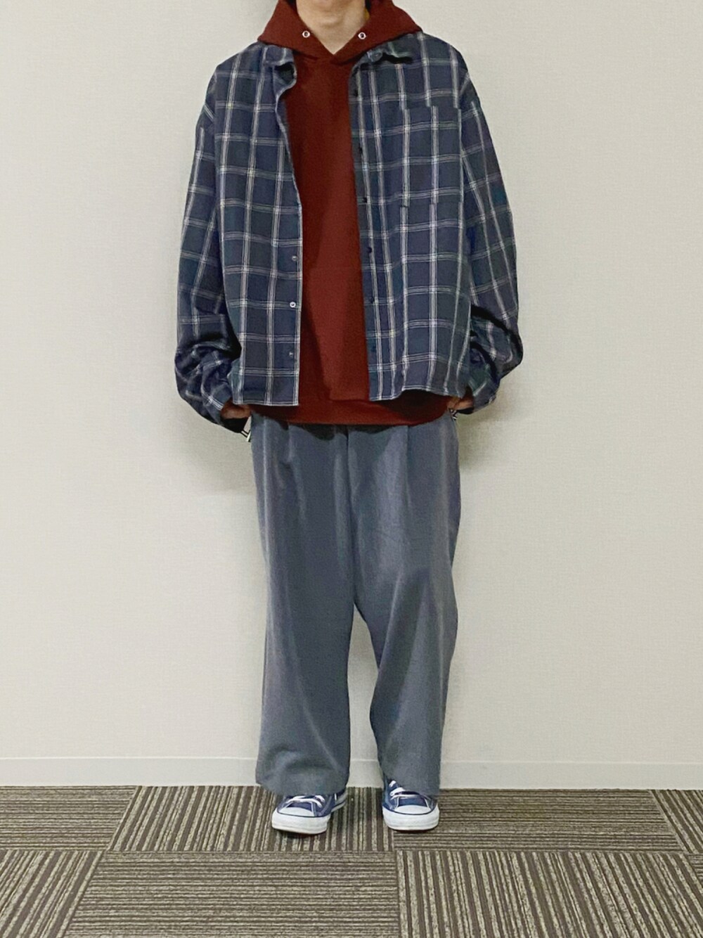 お疲れさまです。うのです。 ゆるチェックコーデ。 ネイビーとグレーって中間色で ひとつのコーデにふたつ入れちゃうと ぼんやりしちゃうのであまりしないんですが 今回のコーデはトーンを合わせることで パーカーの色味を強調して落ち着いたテイストに 目の錯覚?か分からないけど グレーにもネイビーにも見える不思議 色彩って面白いなって思う笑