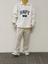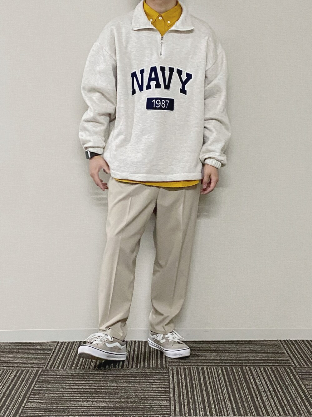 UNOのスウェット「HALF ZIP NAVY LOGO SWEAT SHIRTS / ハーフジップ ネイビー ロゴ刺繍 裏起毛スウェットシャツ」を使ったコーディネート