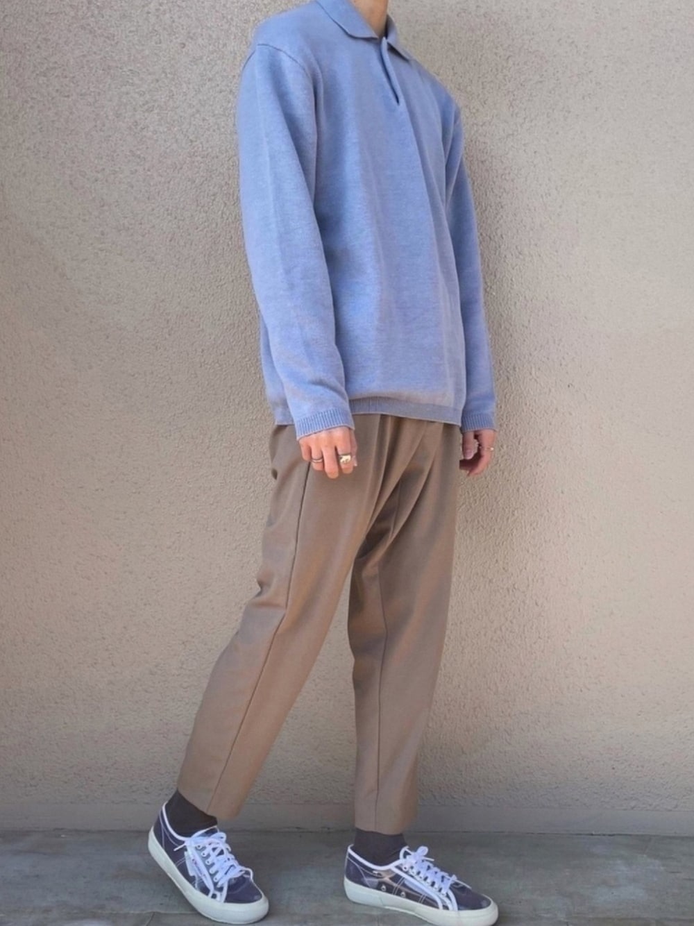 写真を撮るポーズが 本当に苦手で下手なので困ってます。 ライトブルーのポロシャツに ベージュのパンツを合わせたコーデ! ポロシャツはオーバーサイズ派ですか? ジャストサイズ派ですか? スッキリ見せたいならタックインが効果的です! アウター着てればパンツから出して着た方がいいかもですね! supergaの靴は友人から教えてもらい一目惚れ! レディースで39(25.5cm)が一番大きいサイズで困りました… いいね・お気に入り・フォロー よろしくお願いします🙇🏻♂️ Instagramもやってるので 是非見に来てください!