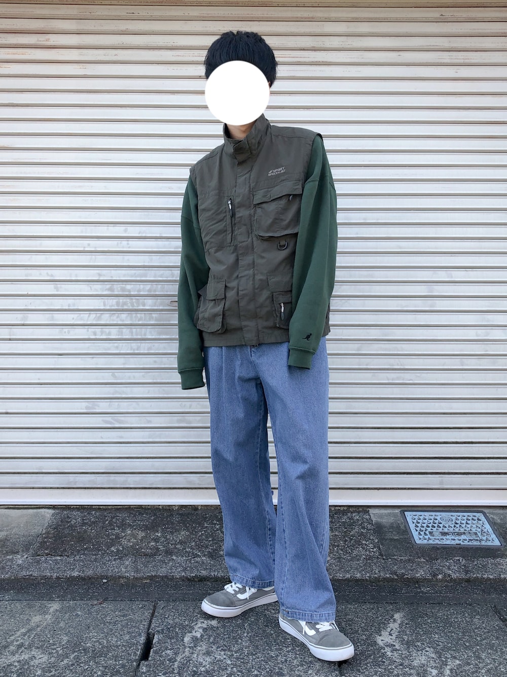 どうも、りゅうです🐉 Instagram ▷ ryu.f.ryu で検索🔎 グリーンスウェット×デニムでレトロ感コーデです! またまた登場、フィッシングベスト🙌🏻 色合い的に古着感がある、このコーデにフィッシングベストで更に古着コーデにしました😊 どこか懐かしいようなコーデになっているかと感じます🙋🏻♂️ デニムは基本的に何色とも合うので万能ですね😎