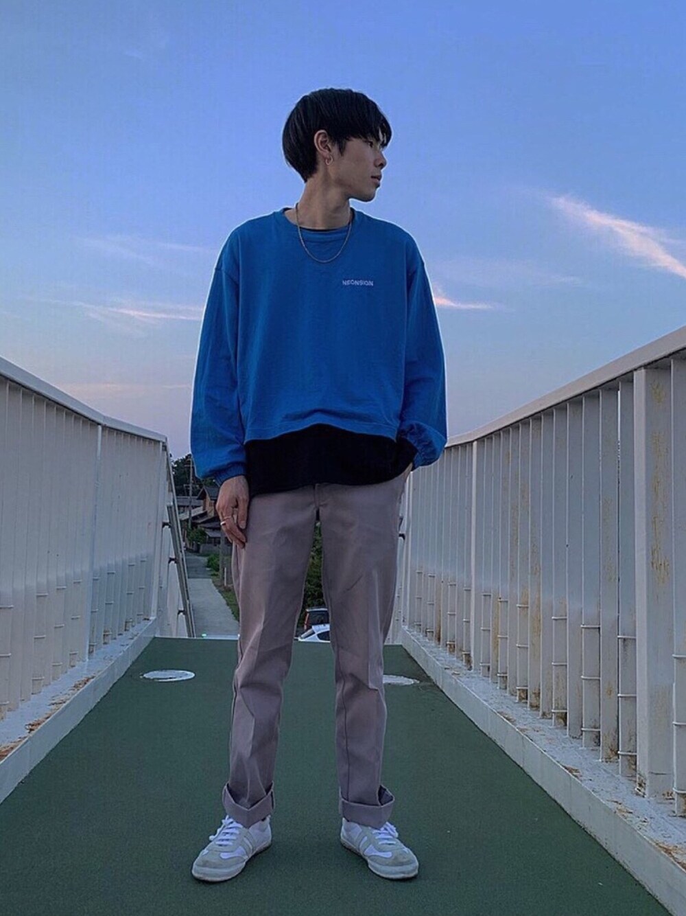 neon signでコーデ組みました。 neon signは1番と言ってもいいくらい 大好きなブランドです。 ショート丈のアイテムだったり、 他のブランドより1癖、2癖あるアイテムが 多いので、よく購入しています。 青のロンTが欲しかったのでドンピシャの アイテムでした!! インナーにあえて黒をもってくることで、 他の人との差別化を図りました。 良いと思ったらいいね、お気に入りお願いします🙃⤴︎