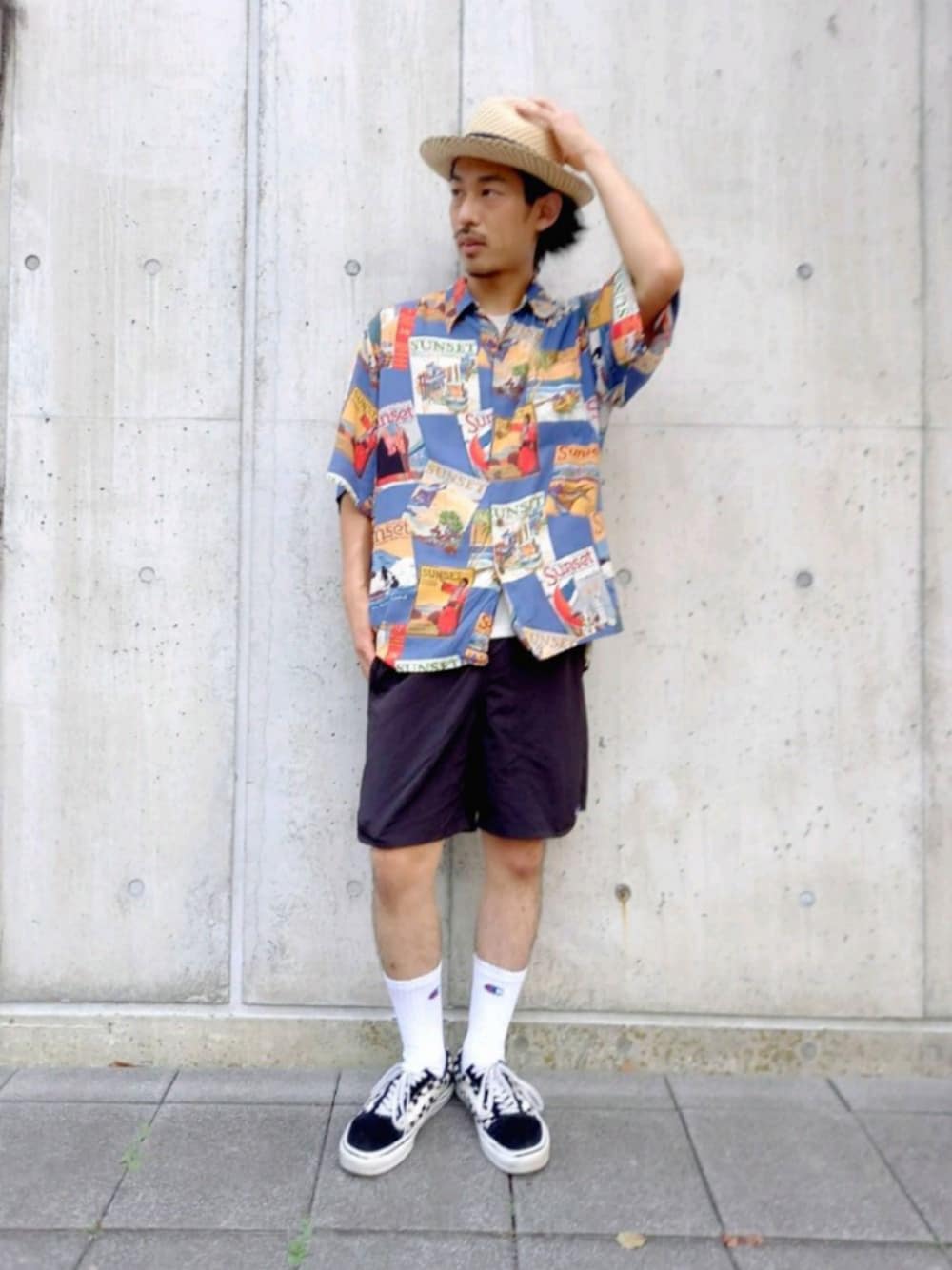 レイスプナーのアロハシャツがポイントなのでそれ以外のアイテムはあえてシックにまとめました!